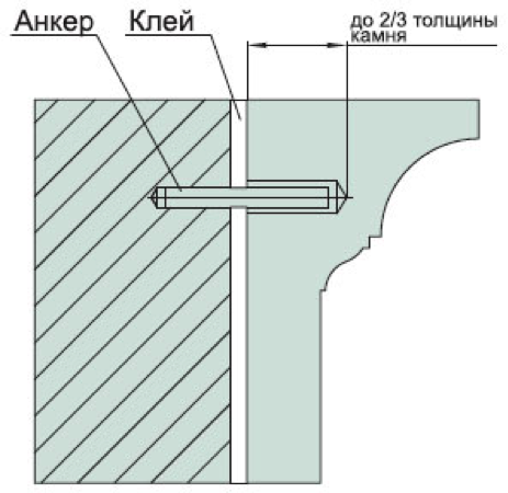- Изделия устанавливаются на анкеры (2 анкера на элемент) и клей. В качестве анкеров допускается использование оцинкованной шпильки, прутка из нержавеющей стали, грунтованной арматуры периодического профиля, а также других крепежных изделий (анкерные крюки, болты и пр.). Анкеры служат для первоначальной установки изделия и удержания элемента в случае разрушения клеевого шва. В качестве клея рекомендуется использовать морозостойкий плиточный клей для наружных работ надлежащего качества.